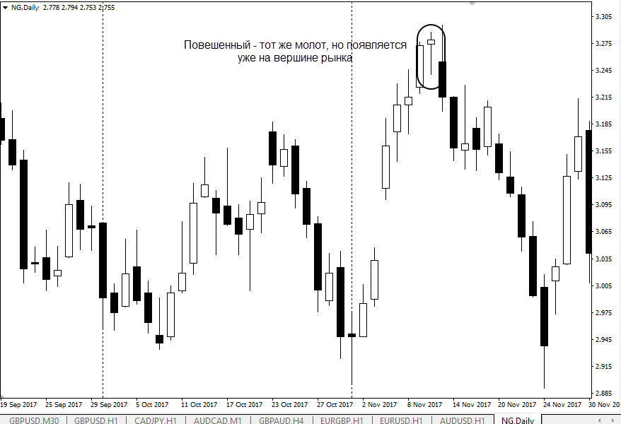 Повешенный – первая попытка медведей переломить восходящий тренд. И хотя заканчивается она неудачно, но затем рост чаще всего прекращается
