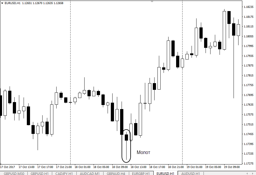 Очень близким паттерном к падающей звезде является Молот. Он предвещает скорый приход растущего тренда. Имеет вид маленькой свечи без верхней тени (или очень маленькой), но с длинной нижней. При крупных таймфреймах цвета значения иметь не будут, но на коротких интервальных сделках белый будет сильнее чёрного.
