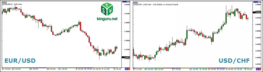 Теперь сравним противоположный вариант, пары EUR/USD и USD/CHF. У них все наоборот, сильная обратная корреляция, где коэффициент нередко достигает абсолютного значения -1.00.
