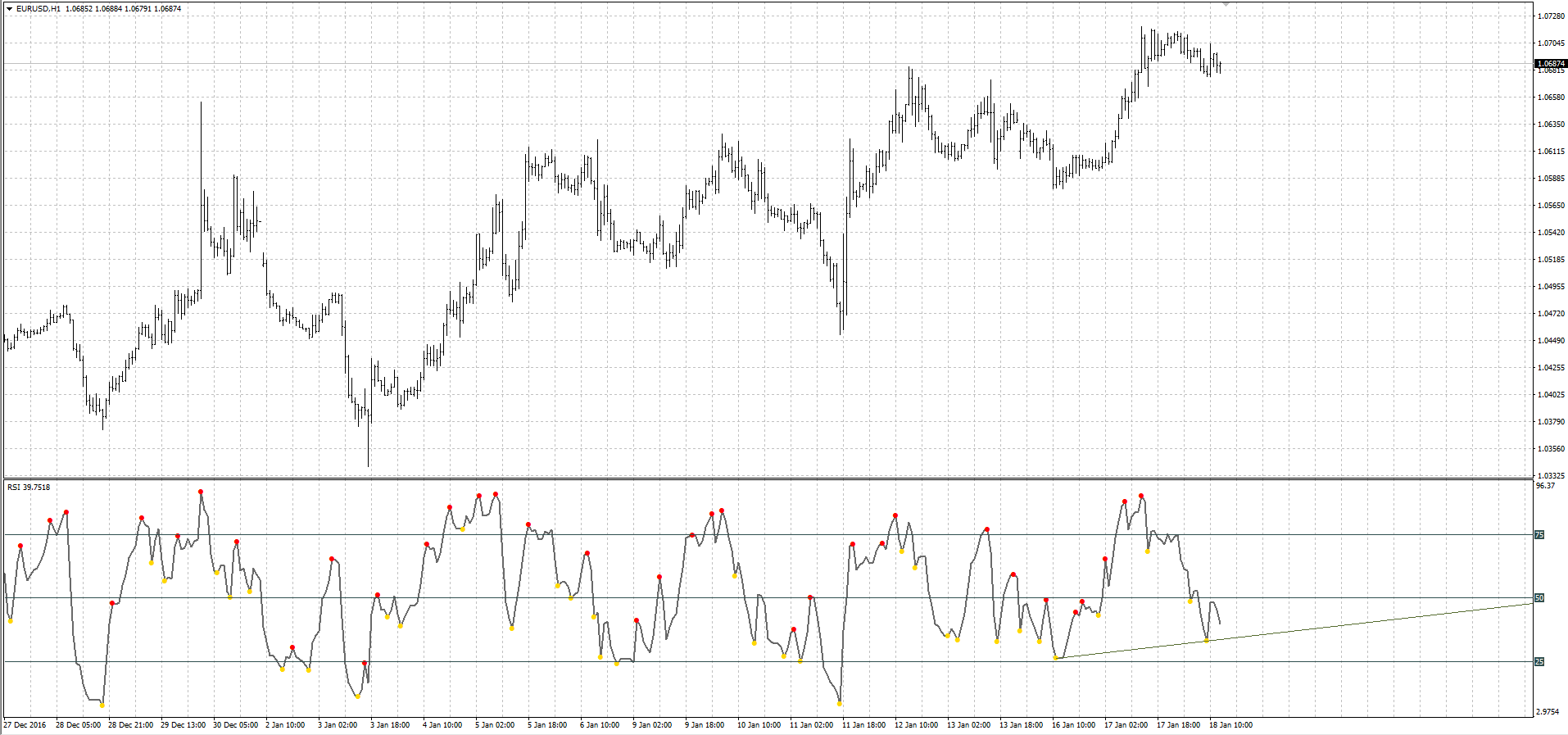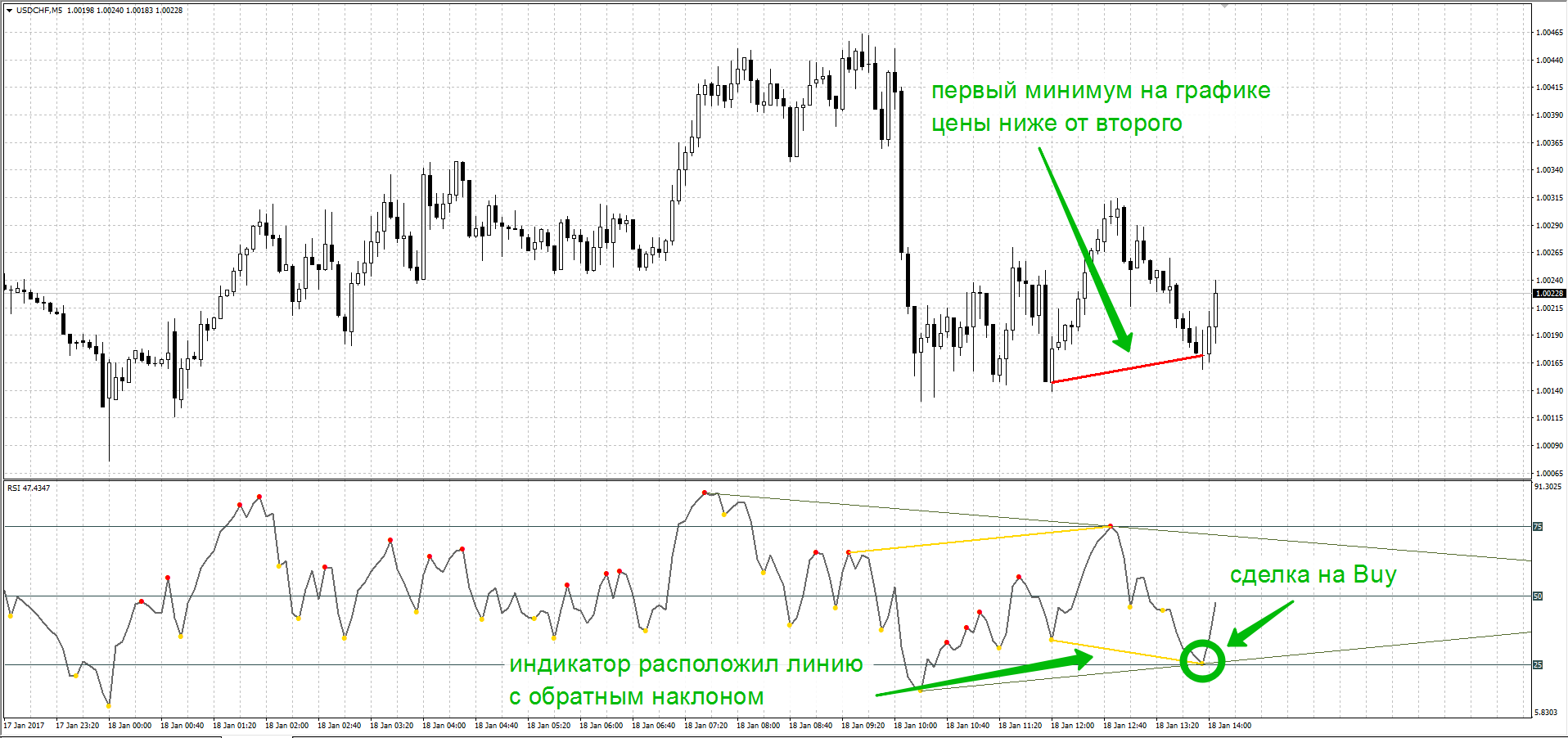 На представленном ниже графике сформировалась ситуация, когда наблюдается прорыв цены вверх: На приведенном графике видно, что первый минимуму цены располагается ниже второго, когда как на гистограмме RSI сложилась обратная ситуация: второй минимум находится ниже. Ордер на покупку следует выставлять в тот момент, когда формируются вторые минимумы.