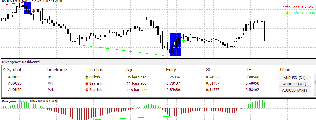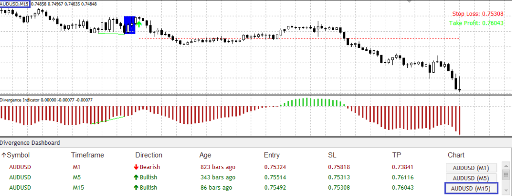 В этом индикаторе есть информационная панель, где отображаются дивергенции (с указанием типа) и сигналы на продажу или покупку для всех временных интервалов (от минутного до месячного) по всем основным валютным парам. Индикатор, который собственно находит дивергенции называется Divergence Indicator (он и был создан вначале) — это видоизмененный MACD без дополнительного скользящего среднего.
