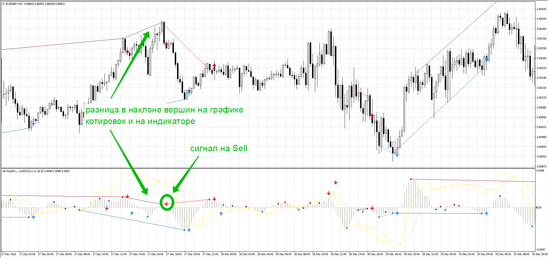 Сигнал о дивергенции индикатор подает путем нанесения на график цены наклонных линий, которые автоматически проводятся между вершинами и низами графика котировок и вершинами и низами гистограммы MACD, а также стрелок, которые указывают нам направление для торговли: