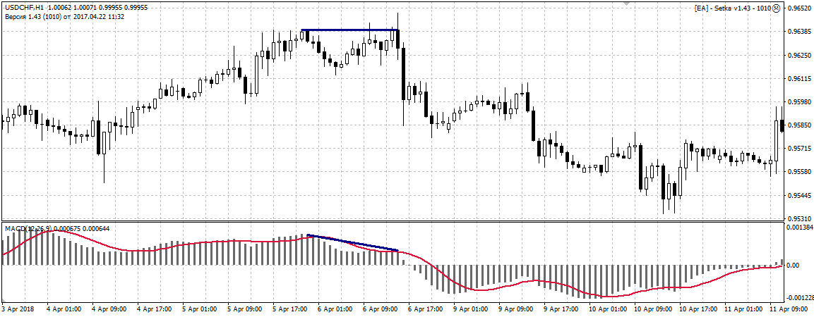 Как видите – на графике котировок первая вершина заметно ниже второй, а на индикаторе вторая вершина линии индикатора выше от первой. После построения второй вершины время заключить сделку на продажу.