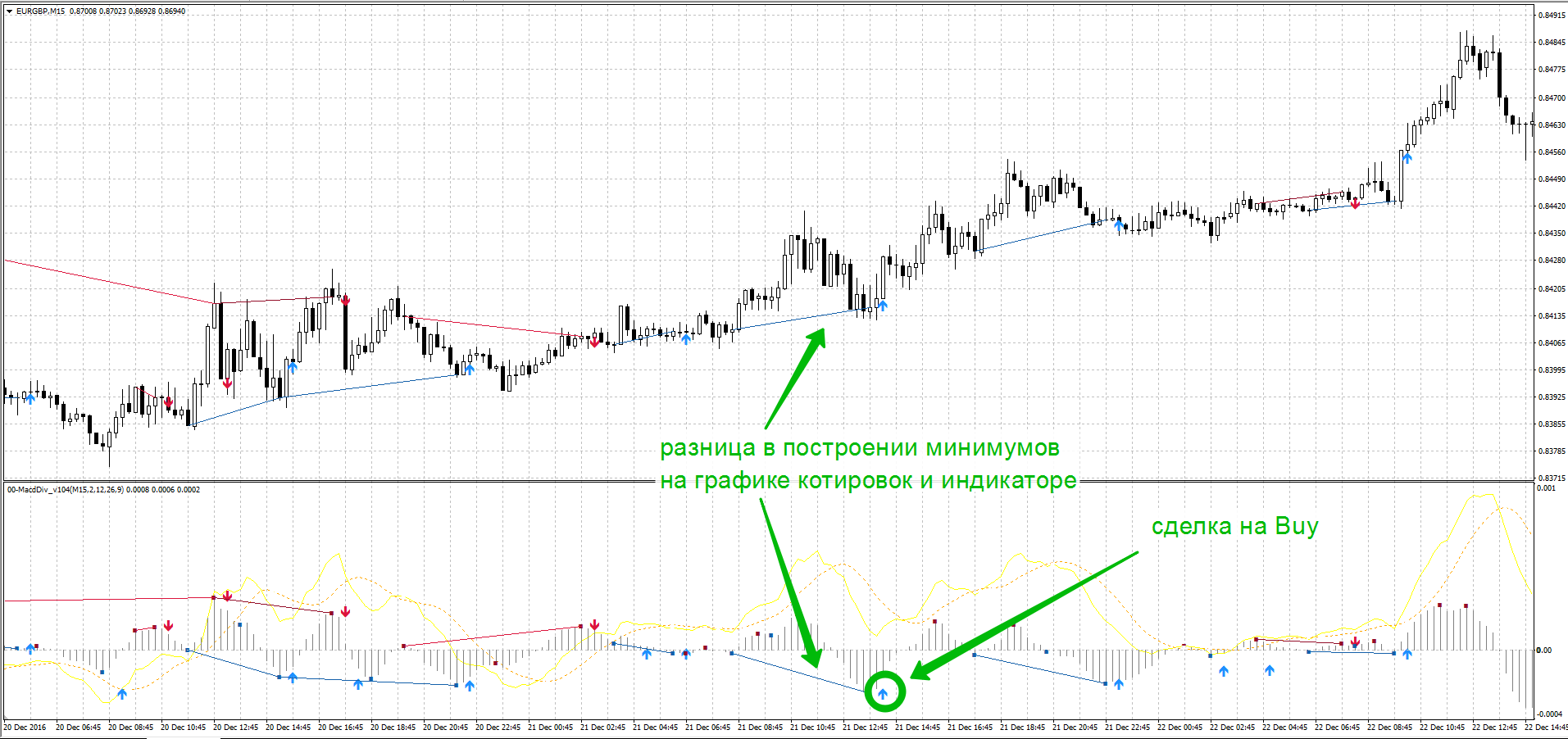 Индикатор отметил разницу в построение минимумов на графике котировок и технического индикатора, а также — разместил сигнальную стрелку, показывающую направление торговли.