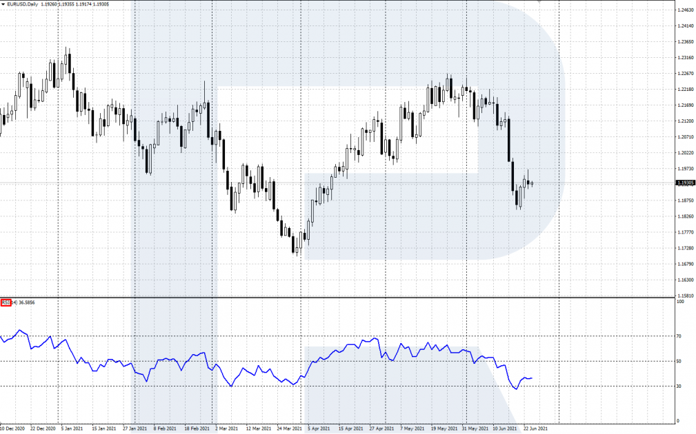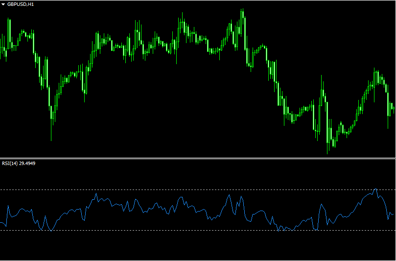 Индикатор RSI строится в отдельном окне под графиком выбранного актива. Торговые сигналы индикатора генерируются с помощью обозначенных уровней: 30, 50 и 70. Область выше 70 называется зоной перекупленности, здесь появляются сигналы на продажу. Область ниже 30 называется зоной перепроданности, в ней рассматриваются сигналы на покупку. При наличии явно выраженного тренда рекомендуется брать сигналы RSI только в сторону действующей тенденции.