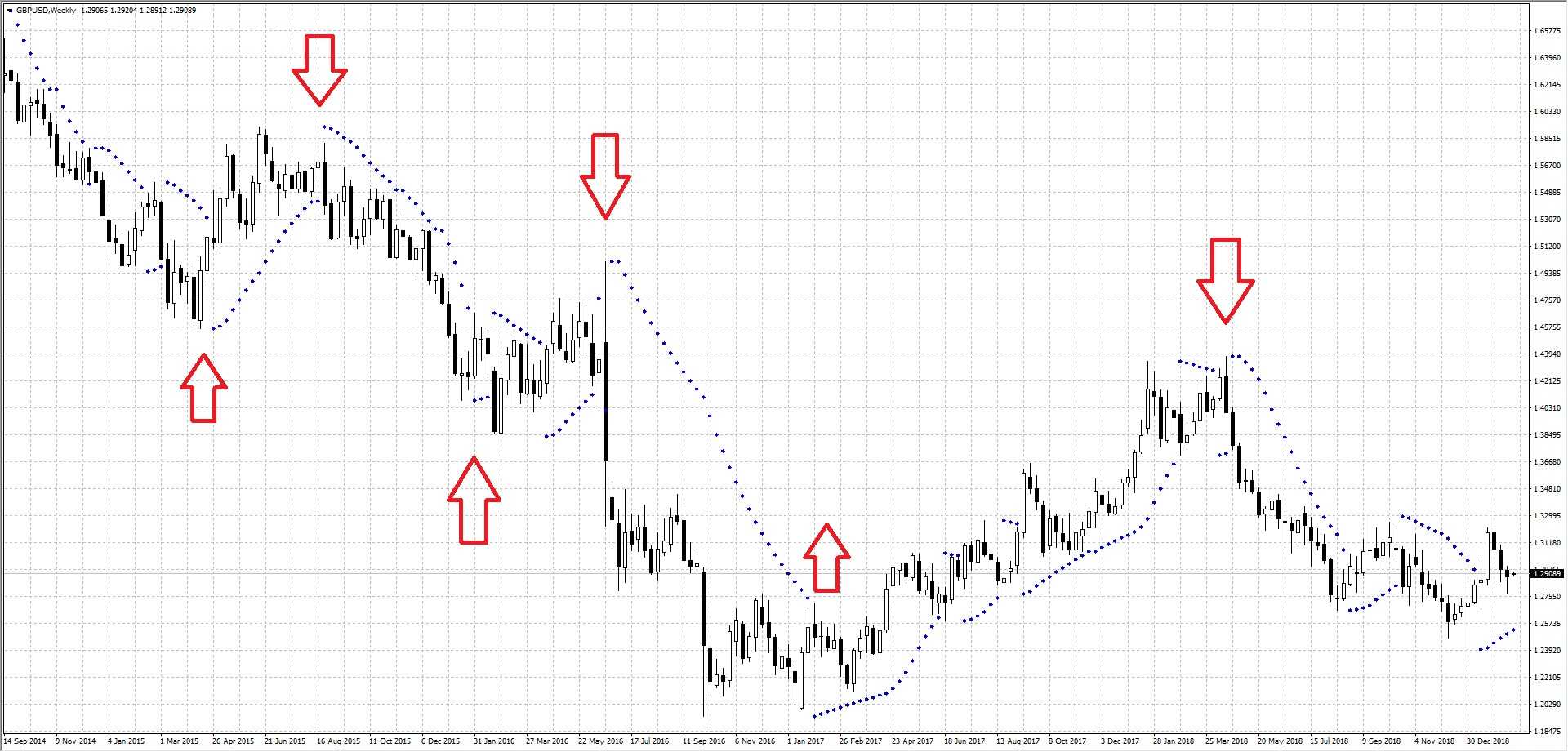 Очень удобно в этом индикаторе то, что его легко использовать. Изначально, если точки находятся ниже свечей, то это сигнал покупки, а когда точки над свечами, это сигнал продажи. Наверное, это самый простой в использовании индикатора, так как он предполагает движение цены либо вверх, либо вниз. И все же этот инструмент лучше всего использовать на трендовых рынках, которым присущи долгие ралли и такие же откаты, и ни в коем случае не стоит им пользоваться во время боковых движений.