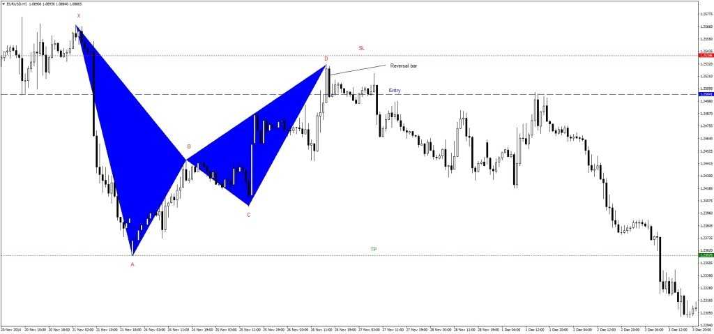 Пример медвежьего паттерна Летучая мышь в нисходящем тренде на часовом графике EURUSD с паттерном price action Внутренний бар(он же Харами), который подтверждает разворот.