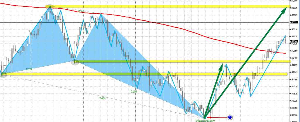 По окончании формирования последней точки фигуры цены могут совершить движение вверх или вниз, как минимум на 50% и максимум на 100% (и выше) ее границ. На примере ниже трейдер наблюдает Bullish Butterfly – бычью бабочку, что теоретически гарантирует восходящее движение из точки окончания формирования (1) фигуры, до ключевых X или В и вполне возможно, что и выше максимальной «вершины крыла».
