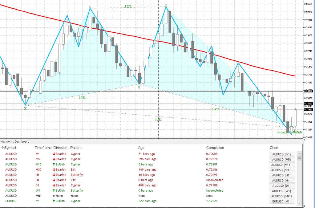 Выбор и отображение конкретных гармонических паттернов на графике происходит передвижением ползунка, расположенного на правой стороне таблицы. Так же можно нажать на окно с названием инструмента и ТФ. Отображение модели и смена инструмента и временного формата графика произойдет автоматически.