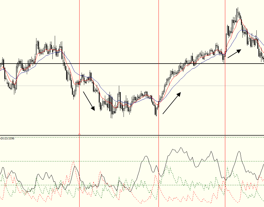 Индикатор ADX состоит из трех линий. Первой линией является линия ADX, второй и третьей, соответственно, линии +DІ и — DІ.