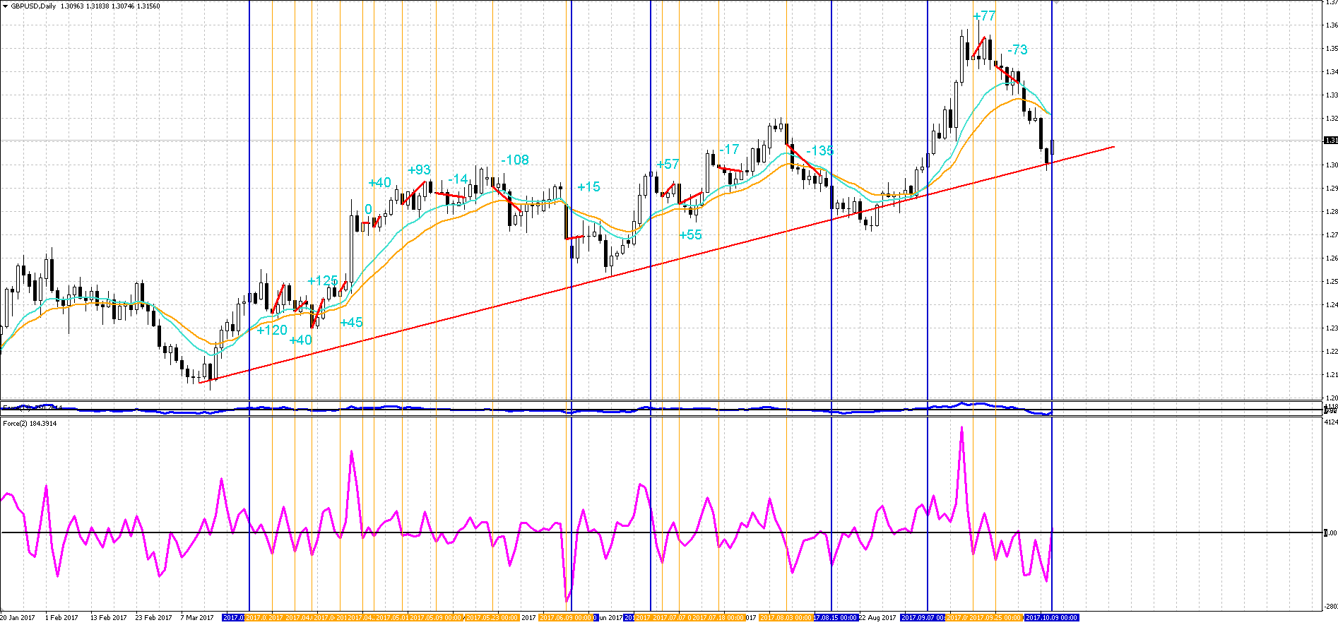 Короткая МА позволяет трейдеру открыть ордер на пике отката. Основной навигацией движения в такой системе служит МА с периодом 13, так как указывает на начало и направление тренда, а индикатор Elder Force Index дает превосходные точки входа.