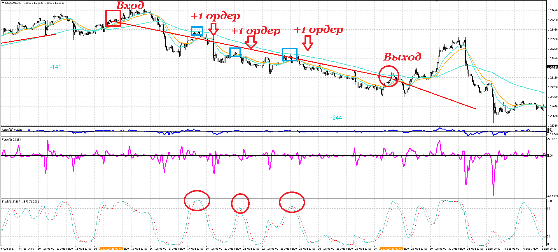 Система вполне годится как для ручной, так и для автоматизированной торговли. При этом она очень проста и имеет довольно большой потенциал для модернизации опытными трейдерами. Например, можно заменить простой фильтр долгосрочного тренда более эффективным, также можно использовать доливки по мере накопления профита на внутридневных графиках (на часовых, например). Вот простой пример доливок по индикатору Stochastic Oscillator к первоначальной сделке по паре USDCAD, рассмотренной ранее: