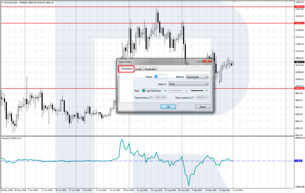 The Force Index is displayed in a separate window under the price chart and consists of one main line and the center zero level. Elder recommends D2 and D13 for short-term and medium-term trading, respectively. The Force Index is included in most trading platforms, MetaTrader 4 and MetaTrader 5 among them.