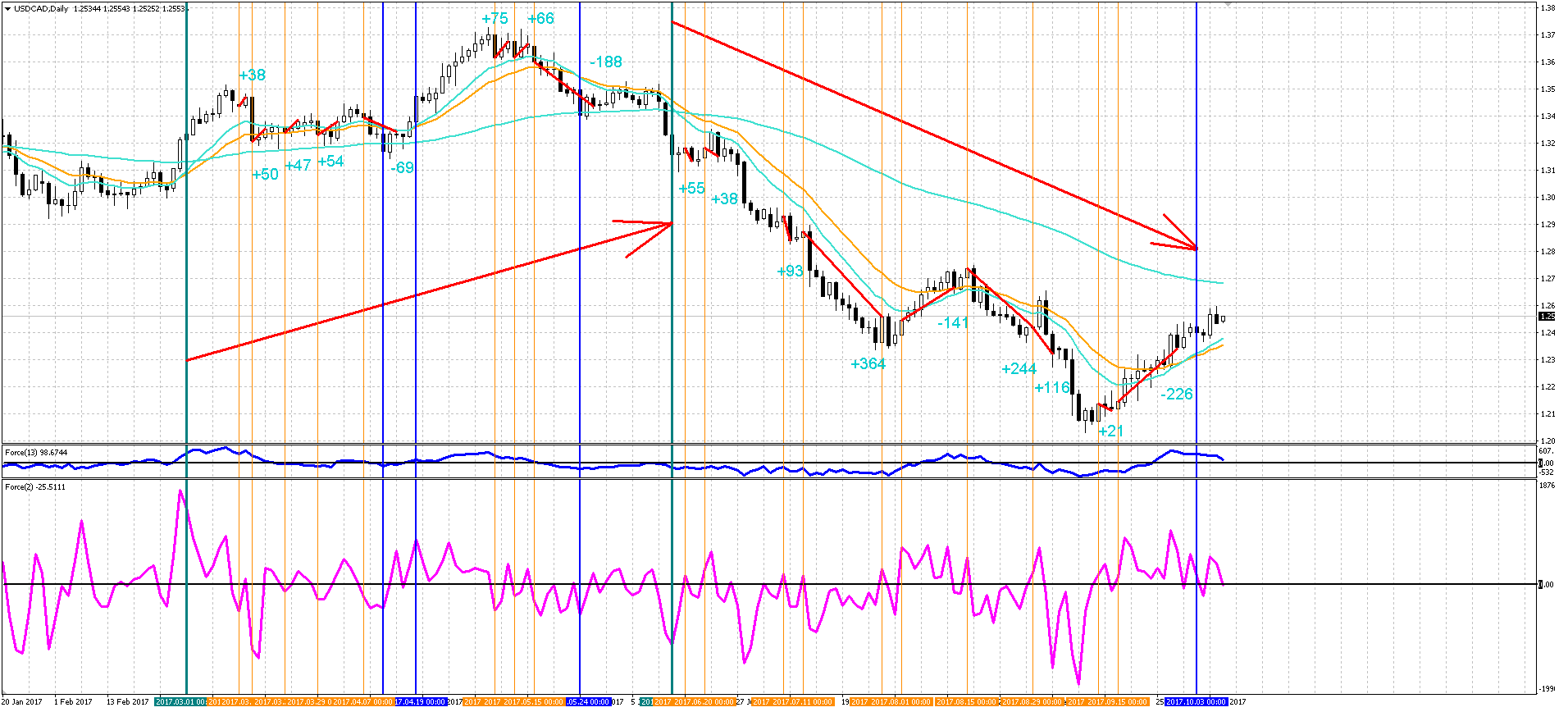 На выбранном ближайшем периоде с 23 марта 2017 года по такой системе было совершено 16 сделок по валютной паре GBPUSD. Пять из них оказались убыточными, принеся 347 пунктов убытка, одна закрыта с нулевой прибылью, остальные 10 принесли 666 пунктов. В общей сложности было заработано 319 пунктов. Конечно, эта система далека от совершенства, но она проста и полностью механистична – от трейдера требуется только раз в день заходить в терминал для поиска сигналов, которые к тому же совершенно явно определены. Тем более стоит помнить, что валютная пара не одна, и система вполне неплохо работает на любой валютной паре. Вот, например, USDCAD:
