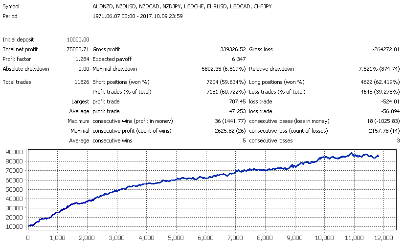 За тот же период совершено 17 сделок, 13 из них закрылись с общей прибылью в 1261 пункт и 4 убыточных с убытком 624 пункта. В целом по паре мы в плюсе на 637 пунктов. Тут вы можете заметить несколько довольно крупных убытков. Их можно было бы избежать или минимизировать, используя установку стоп-лосса сразу за экспоненциальными скользящими средними. Дополнительно улучшило бы систему подтягивание стопа вслед за более медленной ЕМА21, а также перевод в безубыток после нахождения в рынке в течение 5 дней. Стратегия примерно одинаково работает на всех валютных парах с одними и теми же настройками, поэтому привожу сводный тест выборочно взятых наугад валютных пар: