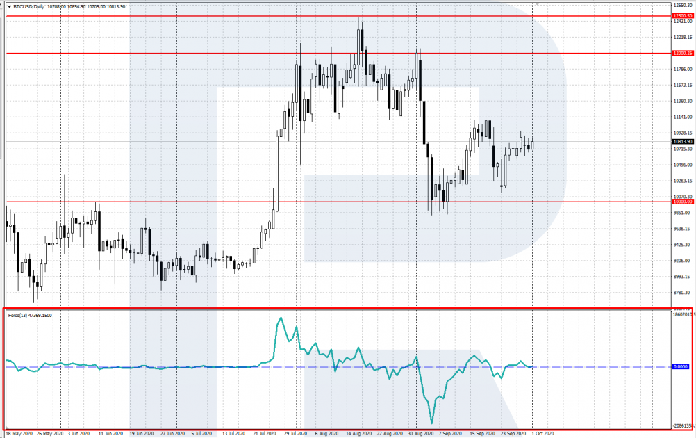 The Force Index gives us an idea of the market direction. If the line of the indicator is above 0, demonstrating another high, this means an uptrend and the dominance of the bulls. If the Force Index drops below zero, forming local lows, the market is in a downtrend, and the bears are ruling.
