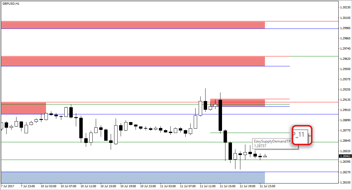 Для каждой из зон индикатор рисует уровень входа, стоп лосса и тейк профита. Из-за этого график напоминает кашу из линий и зон разного цвета. Но линии при этом можно идентифицировать по индексу. При наведении мышкой на объект во всплывающей подсказке выводится его название. Так вот, линии, принадлежащие к одной группе, будут иметь одинаковое число в названии.