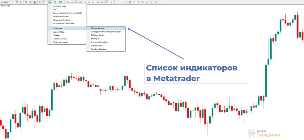 Делается это просто – нужно зайти в список доступных индикаторов. Соответствующая кнопка есть на панели инструментов в верхней части рабочего пространства. На экране появится список категорий индикаторов, доступных в программе. Практически все брокеры предоставляют Метатрейдер с уже предустановленным набором индикаторов. В этот список попадают проверенные временем алгоритмы, которые уже считаются классикой индикаторного анализа.