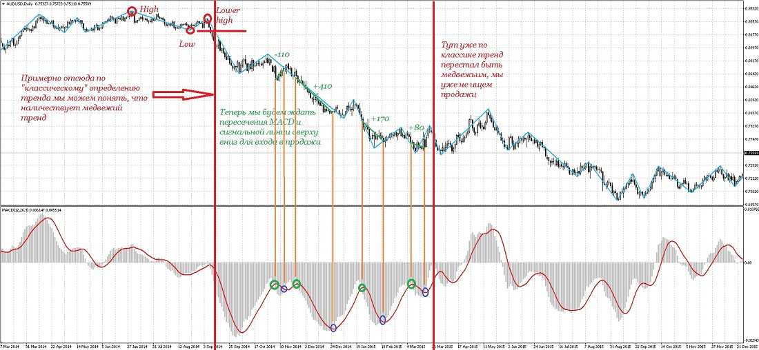 При применении этого типа сигнала покупки берутся, когда гистограмма MACD пересекает сигнальную линию снизу вверх. Для продаж все наоборот. Данный тип сигнала берется при наличии хорошего тренда. Например, на медвежьем тренде входят в продажи при пересечении индикатором MACD сигнальной линии сверху вниз, а выход из сделки осуществляется при обратном пересечении. То есть вход в сделку происходит зачастую как раз на окончании отката против тренда, а выход при признаках его начала. На картинке выше представлен пример торговли на пересечении MACD и сигнальной линии. Тренд определяется по классическим правилам – у нас есть локальный максимум и локальный минимум. Когда появился новый локальный максимум ниже предыдущего, появилась возможность для смены тренда. Когда уровень предыдущего минимума был пробит, можно было предположить о появлении нового медвежьего тренда и начать ждать сигналы на продажу по индикатору MACD. Прежде, чем нарушился порядок high-low (новый хай в конце концов оказался выше предыдущего, что сигнализирует о возможной смене или окончании тренда), мы совершили 4 сделки, три из которых завершились приличной прибылью и одна небольшим убытком.