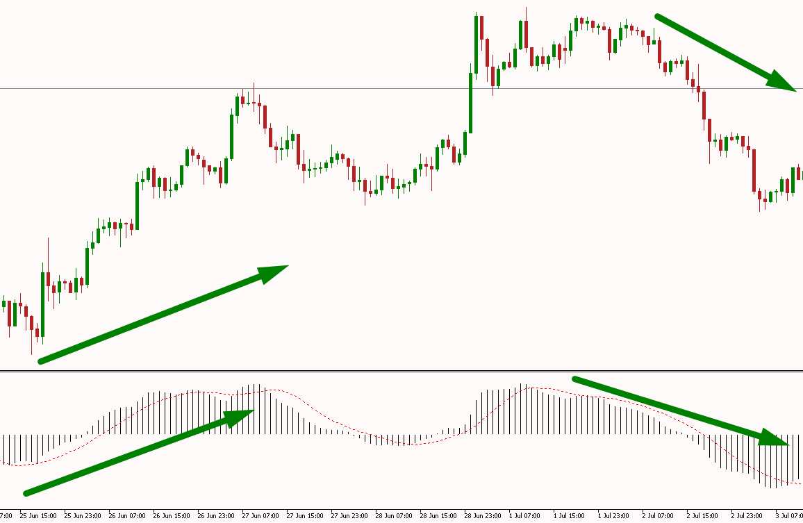 - В виде гистограммы – последовательно увеличивающихся или уменьшающихся столбцов красного (нисходящий тренд) и зеленого (восходящий) цветов.