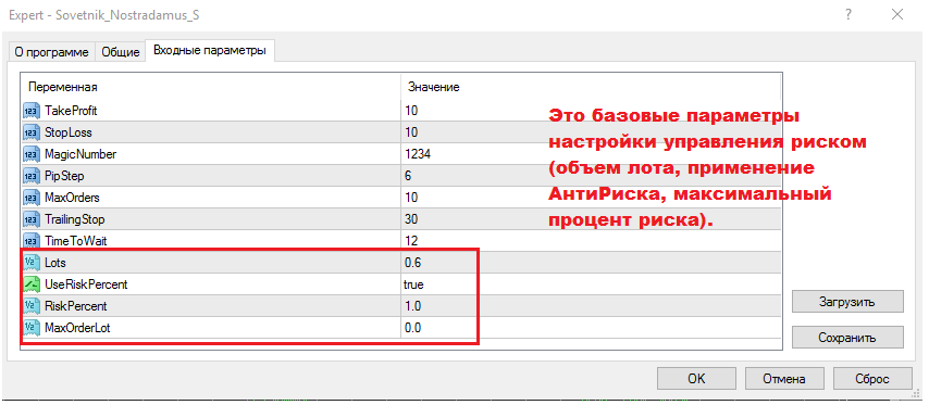 - RiskPercent / UseRiskPercent – процент от депозита используемый советником Nostradamus, и вкл./выкл. автоматического расчета объема следующей сделки.