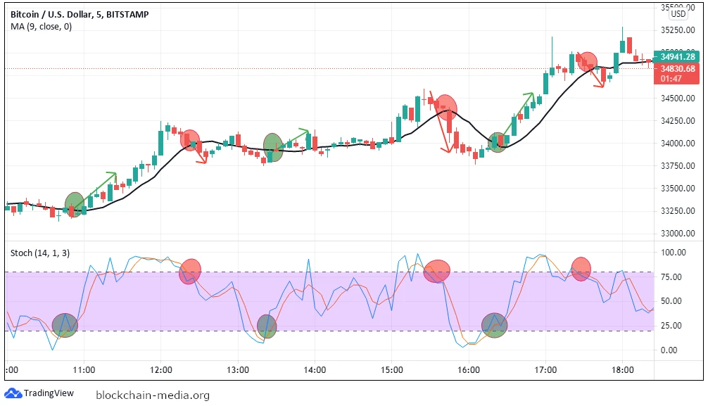 Вот пример на примере BTC/USD. Мы использовали 5-минутный график с индикатором скользящей средней (MA) в качестве индикатора тренда и осциллятором стохастик для импульса.