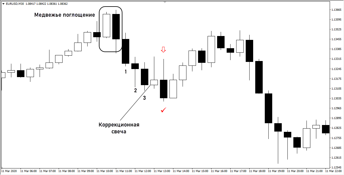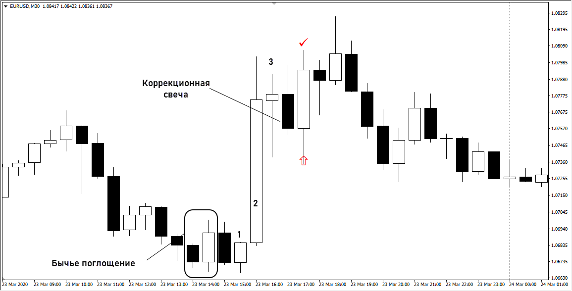 - ордер на покупку ставим, если первая свеча была зеленой, а вторая стала красной.