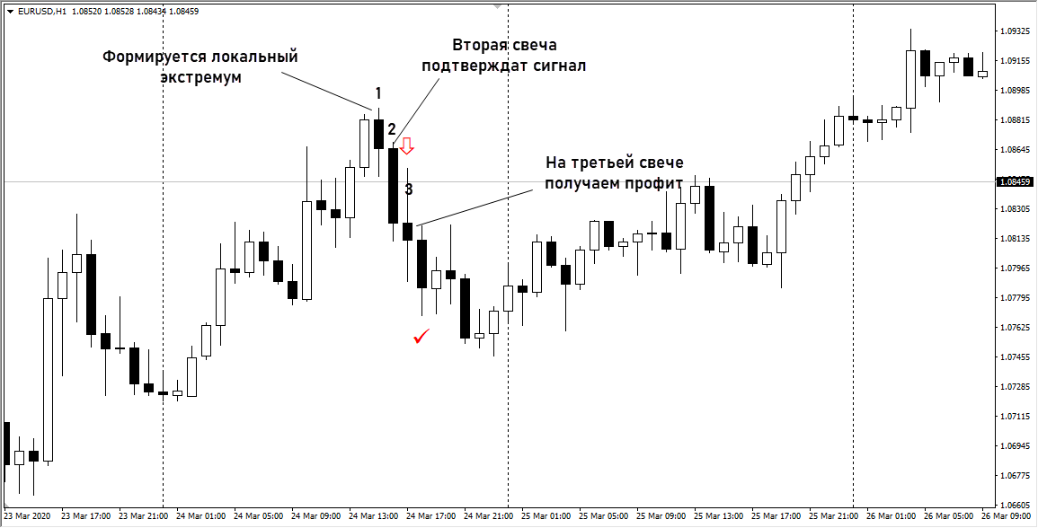 Торговая стратегия для бинарных опционов три свечи немного похожа на предыдущую систему, но отличается более жесткой фильтрацией точек входа. Если прогноз оказывается верным, то формирование паттерна и сама торговля занимает только 3 свечи, отсюда и название.