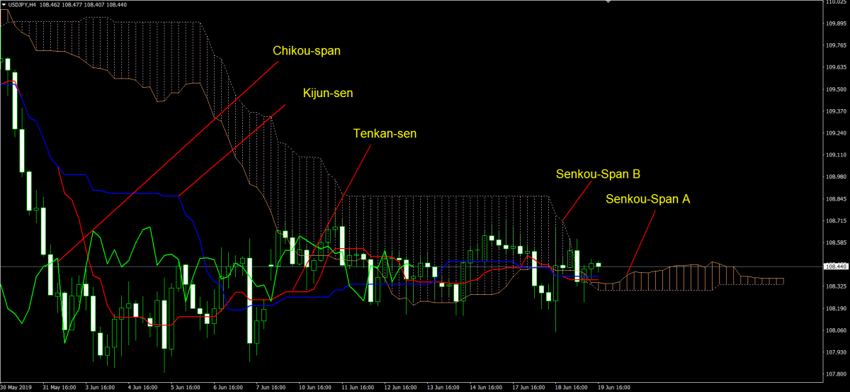 Ниже представлены составляющие индикатора Ишимоку (Ichimoku Kinko Hyo).