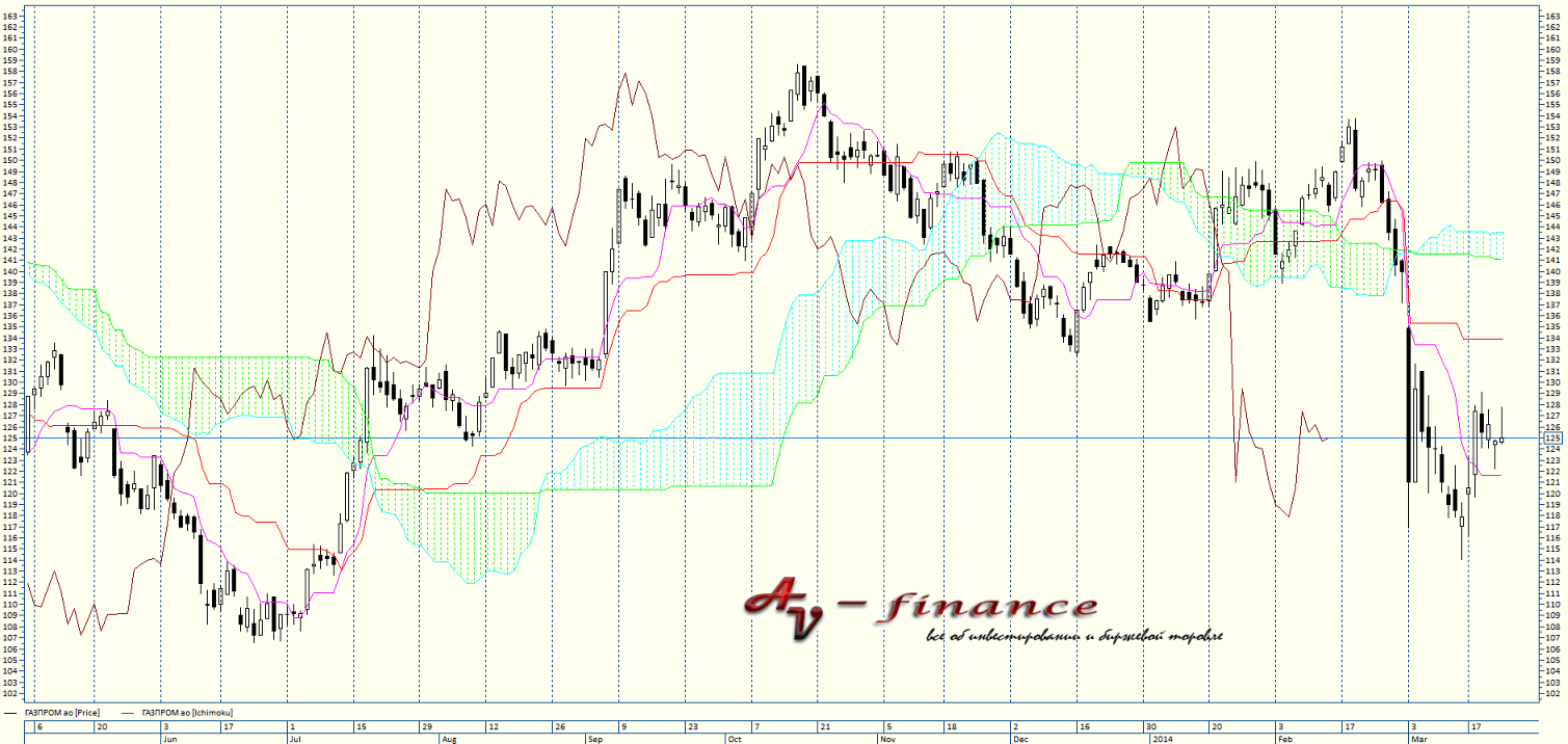 Индикатор облако Ишимоку состоит из центральной линии с двумя ценовыми каналами над и под ней (полосами). Центральная линия представляет экспоненциальную скользящую среднюю, ценовые каналы – стандартные отклонения изучаемой акции.