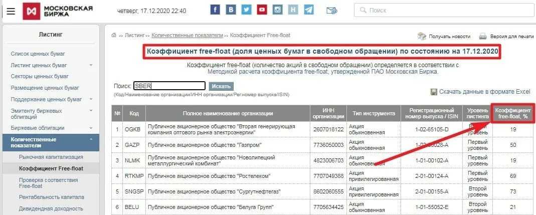 - На сайте Московской биржи есть раздел, где такие данные раскрываются и обновляются — moex.com/ru/listing/free-float.aspx. Так, у ПАО «Аэрофлот» коэффициент free-float составляет 41%, то есть 41% всех эмитированных обыкновенных акций конкретного регистрационного номера находится в свободном обращении на бирже и доступны для торгов.