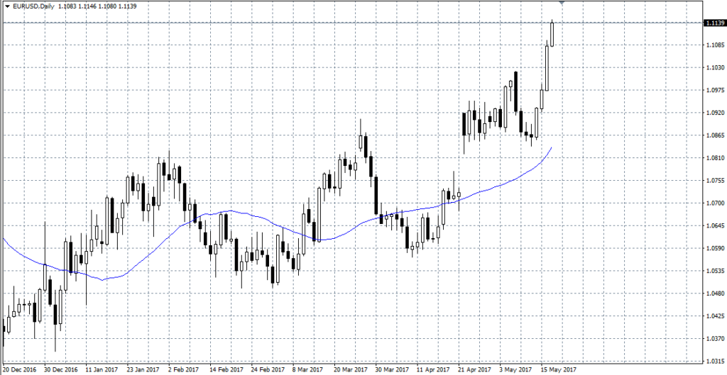 На последок хочу поделиться с вами самой простой, но рабочей стратегией. Она подходит для ловли глобальных трендов и движений. Для этого нам понадобится всего лишь дневной график и две скользящие средние с периодами 21 и 63.