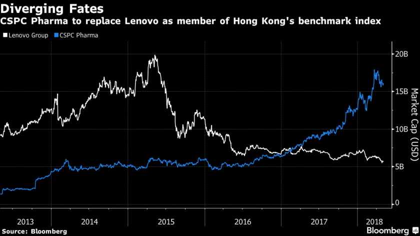 Как сообщает агентство Reuters со ссылкой на заявление компании Hang Seng Indexes Co., решение об исключении Lenovo из индекса голубых фишек было принято по результатам пересмотра семейства индексов Hang Seng по итогам квартала, завершившегося 30 марта. Начиная с 4 июня, место Lenovo в Hang Seng займет китайский производитель лекарственных препаратов CSPC Pharmaceutical Group, чья капитализация с начала 2018 года возросла на 29%, продемонстрировав один из самых лучших результатов среди азиатских медицинских компаний.