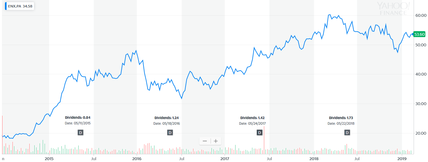 Как видно, с возобновлением самостоятельного существования биржа Euronext показала отличный результат — на начало 2019 года акции, номинированные в евро, практически утроили свои котировки. Дивидендная доходность в последние два года составляет около 3% годовых, что для евро можно считать неплохим результатом. Посмотреть актуальные котировки можно например на .