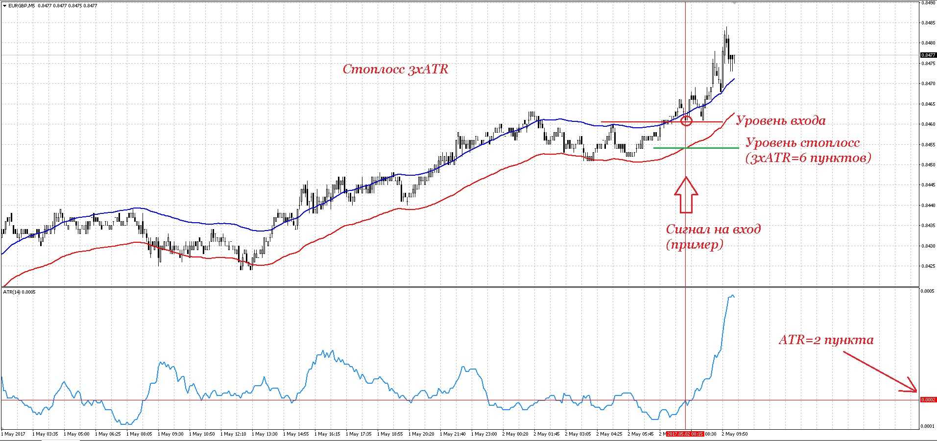 - Значение ATR умноженное на 2 или 3, будет количество пунктов стоп лосса.