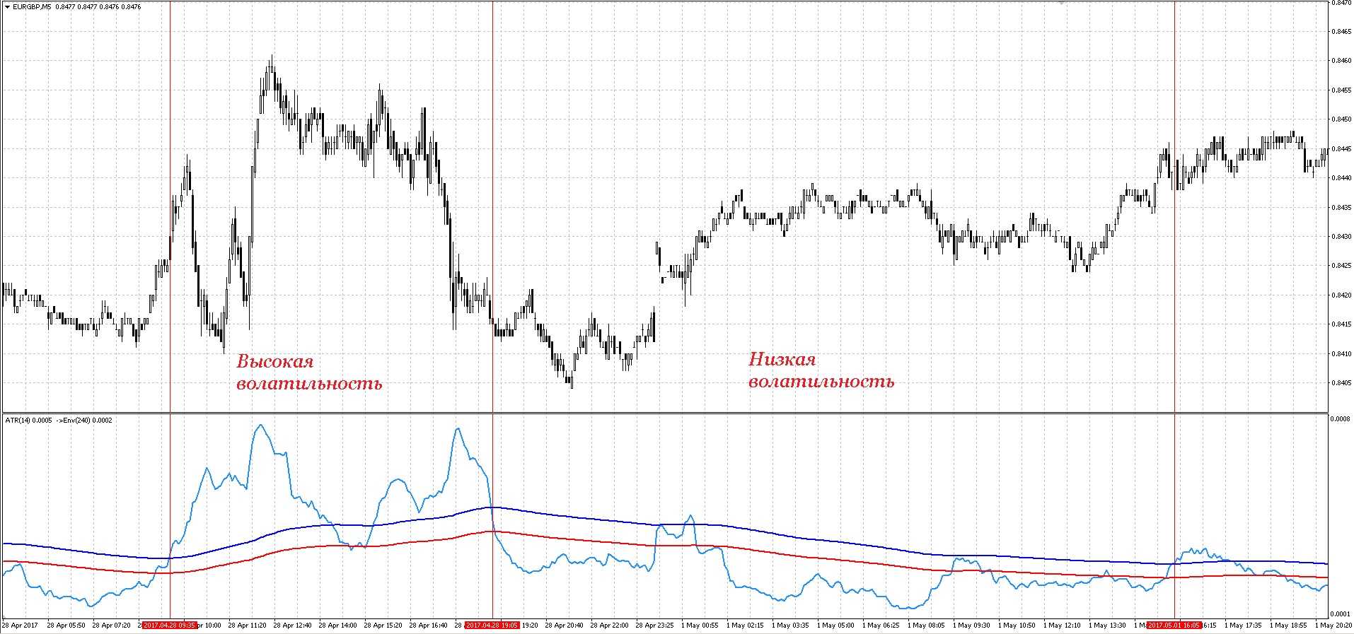 Прекрасно зарекомендовали себя в качестве срединной линии ATR14 и МА100, которые позволяют выявлять период торговли в торговой системе и строятся на правиле возврата к средним. Хорошие отзывы завоевал индикатор Envelopes 240. Совместно с ATR можно делать довольно основательные прогнозы и эффективный анализ. Если ATR находится под Envelopes, то это свидетельствует о низкой волатильности. Если происходит пробой вверх, то высока вероятность начала значимых волатильных движений.