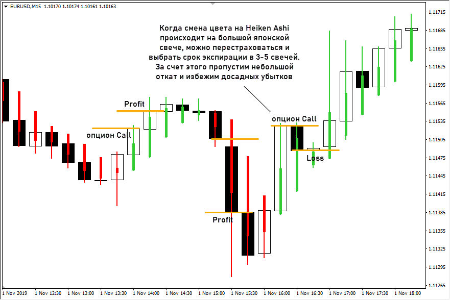 Это делает особо ценным момент смены цвета свечей Heiken Ashi. Практика показала, что если цвет сменился, то далее получим как минимум 1-2 свечи такого же цвета. Это неплохая идея для торговли со сроками экспирации порядка 1-2 свечей.