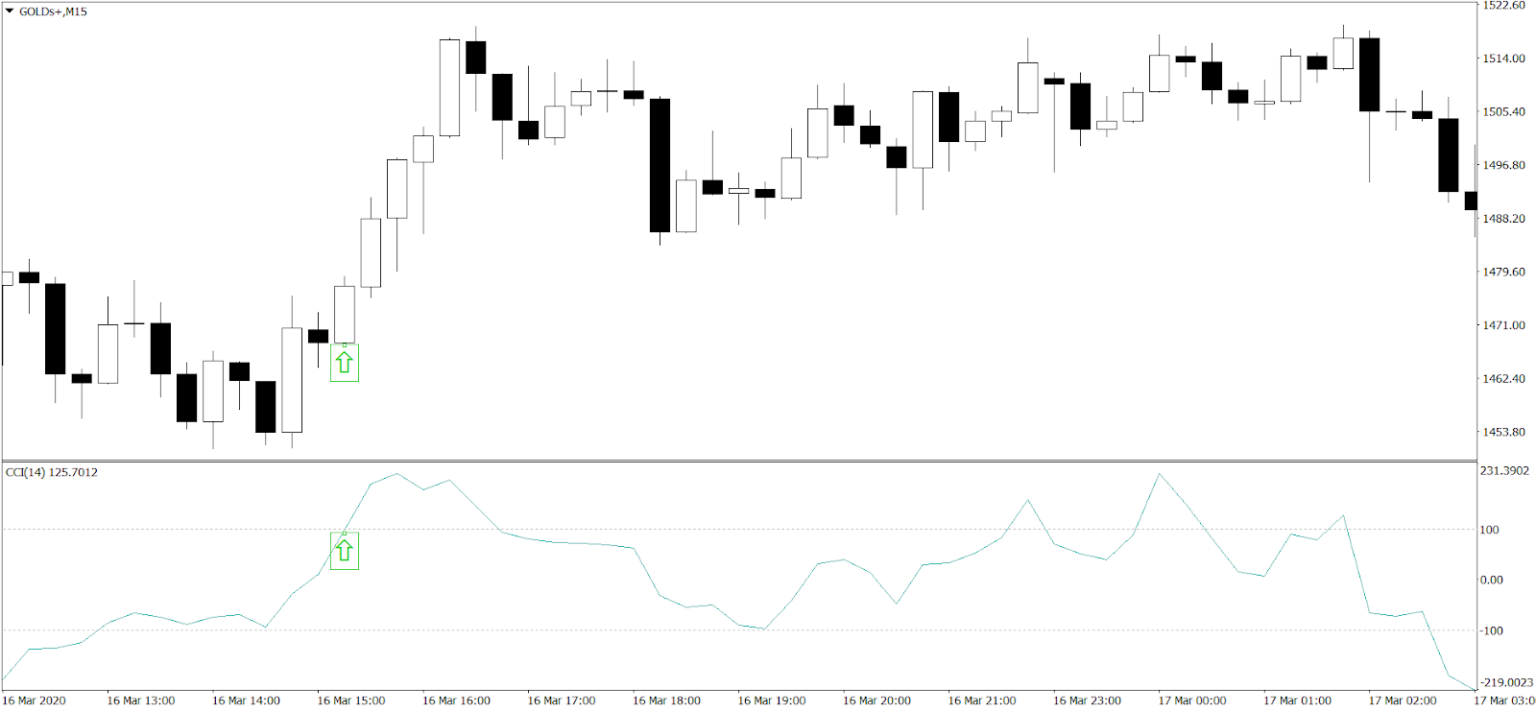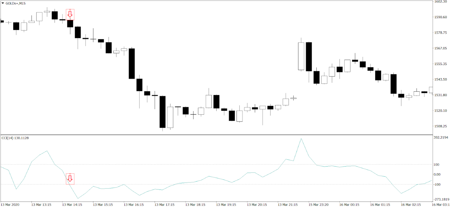 Трейдеры будут стараться продавать, когда CCI указывает на ситуацию перекупленности, открывая позиции в тот момент, когда индикатор при движении вниз пересечет отметку +100. Аналогичным образом, они будут стараться покупать, когда индикатор говорит о ситуации перепроданности, открывая позиции при пересечении им отметки в -100 при движении вверх.