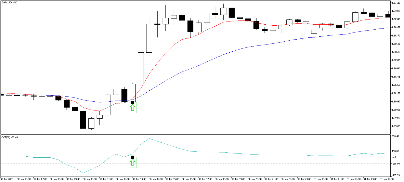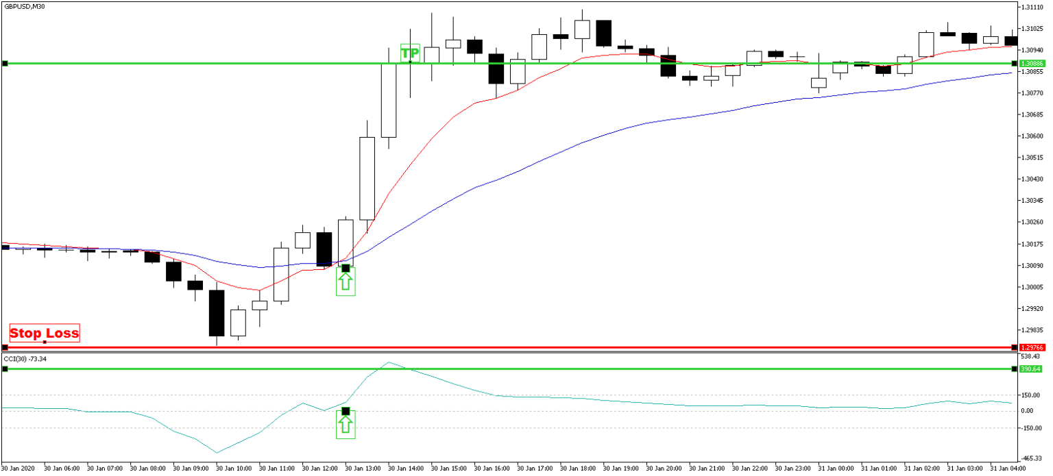 Чаще всего индикатор CCI используется для нахождения разворота тренда. Однако, в этой стратегии мы будем использовать его для торговли по тренду. Обычно считается, что когда этот осциллятор достигает значение выше 100 или ниже -100, то это свидетельствует о перекупленном (перепроданном) рынке. Однако, часто можно заметить, что когда CCI достигает этих уровней без каких-либо трудностей или препятствий, то есть движение очень сильное, то достижение крайних уровней — хорошее место, чтобы войти в рынок в надежде на продолжении тренда.