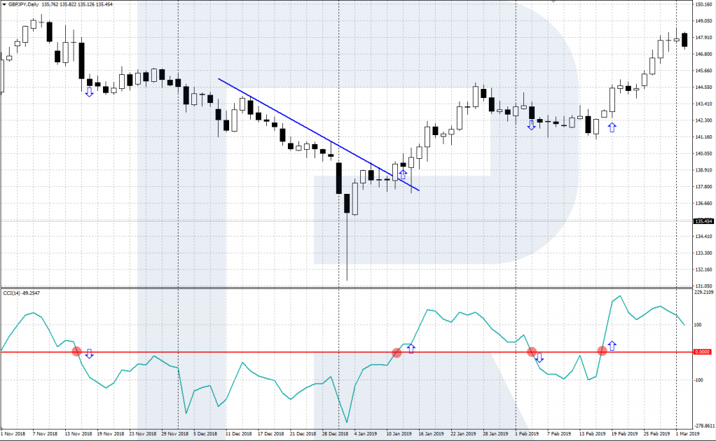 Рассмотрим три основных торговых сигнала, которые генерирует индикатор Commodity Channel Index: