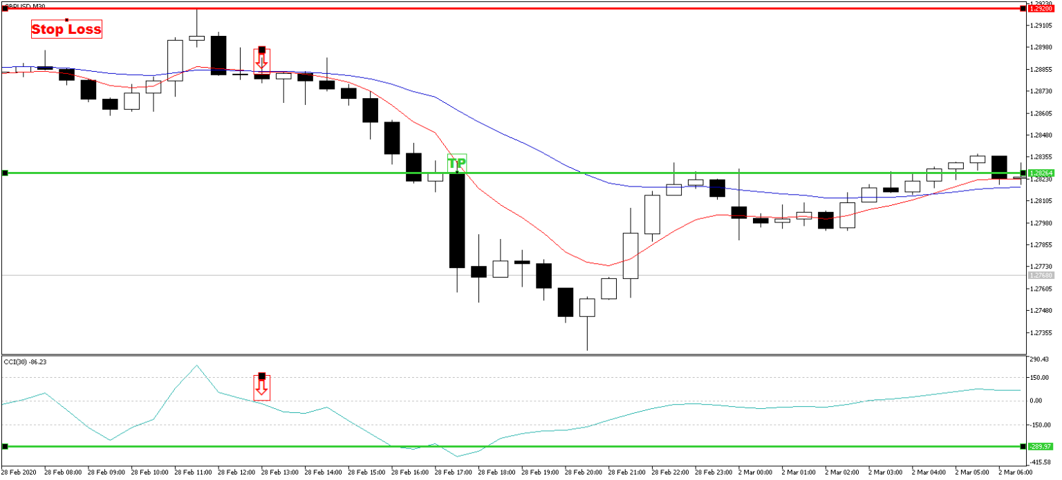 Напротив, в короткую позицию следует входить, когда индикатор CCI пересекает значение -100, а нисходящее движение на его графике продолжается непрерывно, без каких-либо трудностей.