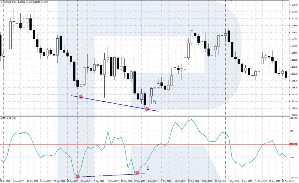 Дивергенция на покупку (бычья) возникает тогда, когда график цены показывает очередной минимум, а линия CCI показывает менее глубокий минимум, чем предыдущий. Это говорит о том, что «медведи» уже ослабли и можно ожидать разворот наверх. После формирования второго минимума и начала движения линии CCI вверх рекомендуются покупки.