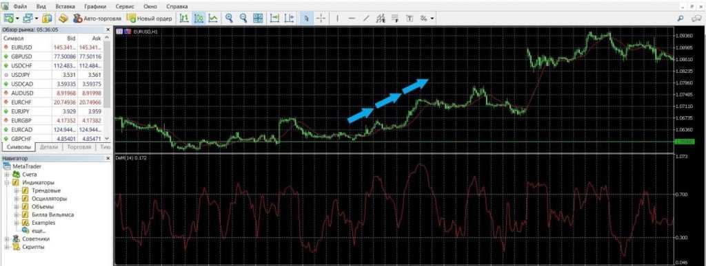Сам индикатор можно параллельно использовать совместно с другими инструментами технического анализа. Наиболее распространенным является его сочетание с трендовыми индикаторами, где трендовый инструмент указывает на долгосрочную тенденцию, а Демаркер помогает найти подходящую точку входа.