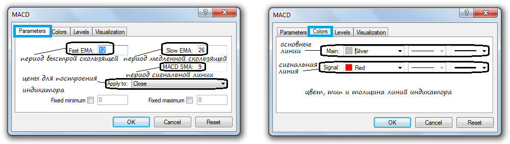 Эти индикаторы аналогичны друг другу, они разработаны также на базе осциллятора Moving Average Convergence/Divergence. Их расчет производится в виде расхождения между показателями MACD и его сигнальной кривой, которая является сглаживающей, вследствие чего формируется Moving Average.