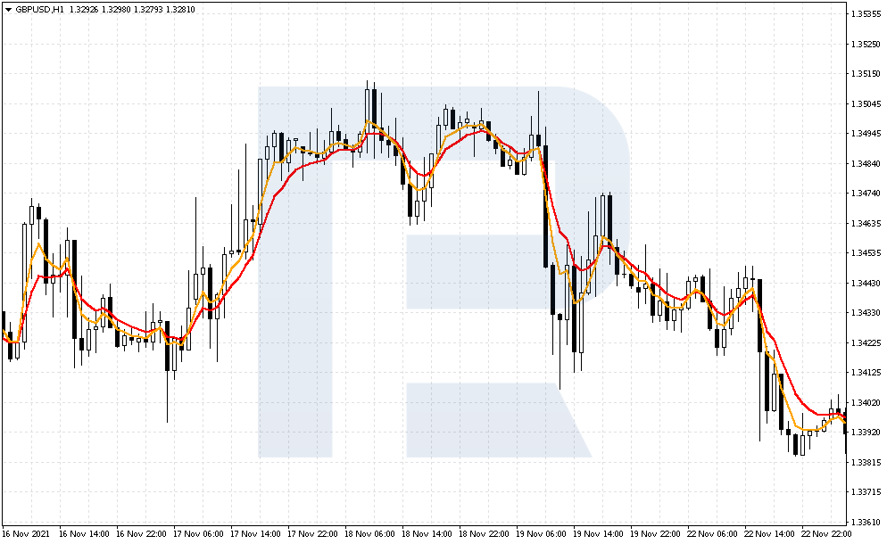 Скользящие Средние используют как указатель направления тренда на больших таймфреймах. Однако пересечение этих линий даёт сигнал и на более мелких графиках. В стратегии «Во флет» пересечение Скользящих вблизи крайних границ Bollinger Bands будет давать сигнал для открытия позиции. Получается, что индикатор Боллинджера используется для поиска боковика на рынке, а мувинги подсказывают, когда нужно в рынок входить.