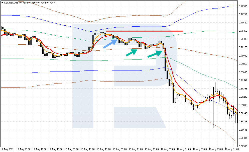 Рассмотрим открытие позиции на продажу на примере валютной пары NZD/USD. Произошёл отбой цены от верхней границы индикатора Bollinger Bands, сами полосы движутся горизонтально. Напомню, что по правилам стратегии, сильным сигналом будет два отскока от линии, но и один отбой – это также сигнал для потенциального открытия позиции.