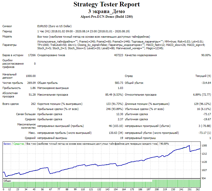 В этом тесте профит составил 0,86% в месяц, но за счет увеличения риска его можно было увеличить до 1,5-2,0%. Сравнительно небольшой показатель, но это доказывает, что тактика 3 экранов работает.