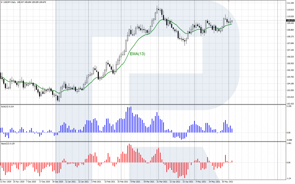 Индикатор Bulls Power показывает силу быков на рынке. Он сравнивает максимальные цены с экспоненциальной Скользящей средней (EMA). Если гистограмма индикатора Bulls Power выше нуля и растет – это означает, что покупатели смогли удержать цены выше EMA и быки сейчас сильнее медведей. Если же гистограмма индикатора начинает снижаться и опускается ниже 0 линии – это говорит о том, что на рынке сейчас доминируют медведи.