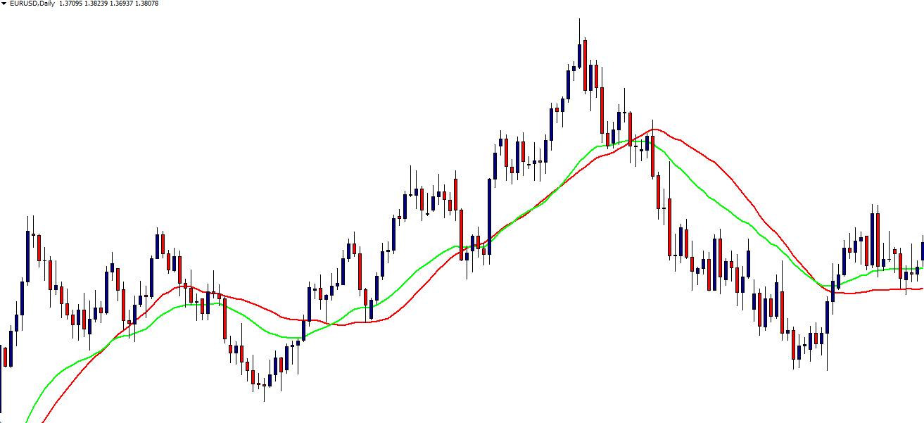 Здесь мы видим, что зеленая кривая (EMA) находится ближе к цене нежели красная (MA), потому, что экспоненциальная кривая (EMA) отображает более точную динамику изменения цен нежели простая (MA). Это происходит благодаря тому, что EMA делает большой акцент на недавно изменившихся ценах, что дает более точные сигналы в текущий момент.