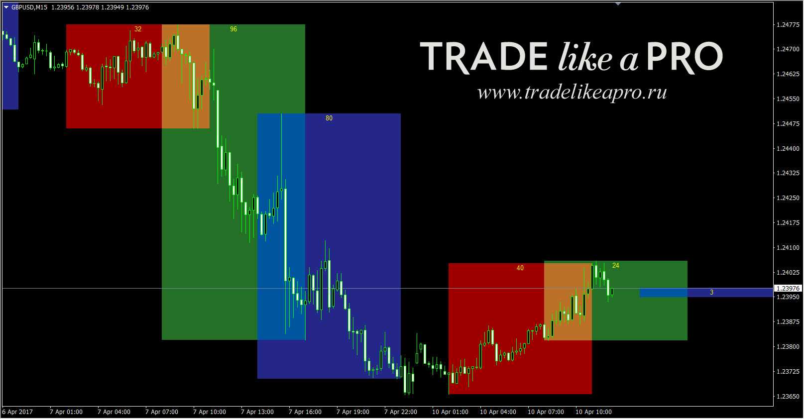 Индикаторов, показывающих/считающих время – представлено огромное количество: от различных таймбаров (считают время до закрытия свечи) до сессионных. Последние будут актуальны для внутридневных трейдеров: как правило большинство стратегий рассчитаны на какие-то трендовые движения, а они есть не круглосуточно, а обычно когда идут лондонская и американская сессии. В свою очередь время азиатской сессии – когда движения рынка минимальны – используется для других стратегий торговли, а так же для великого множества советников – ночных скальперов. Ниже – несколько примеров таких индикаторов.